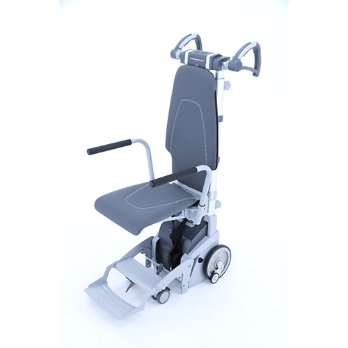 ハンドルにあるスイッチを操作することで、利用者を椅子(車椅子)に乗せたまま階段を一段ずつ上り下りすることができます。